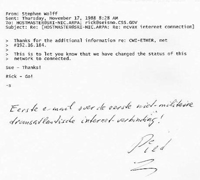 Piet Beertema is a Dutch internet pioneer, who first came across a computer at the National Aerospace Laboratory. In 1966, he took up the post of System Manager at Mathematics Centre (MC), which became Research institute matematics & computer science in the Netherlands (CWI) in 1983, where he continued to work until his retirement. On 25 April 1986, administrative control of the newly created .nl domain was delegated to the CWI (in the person of Beertema) by Jon Postel (IANA). Thus, Beertema effectively became the founder of .nl.