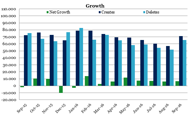 A look at the underlying data quickly reveals why net growth was up: the number of cancellations was down, especially in July and August. Registrars and registrants have traditionally been in the habit of tidying up their portfolios over the summer months by cancelling unused domain names. This year, however, there was little evidence of that happening. In absolute terms, the total number of cancellations was the lowest recorded for a year's third quarter since 2012. We cannot yet say whether people have merely delayed making cancellations, or whether we are witnessing some kind of structural change in the pattern.