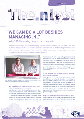 Out this week is the latest edition of SIDN’s magazine, The.nlyst. In our final edition for 2014, Sieger Springer (our Marketing, Communication & New Business Manager) and Hubert Welleman (New Business Manager) describe SIDN’s new business activities. Meanwhile Legal & Policy Advisor Maarten Simon explains why .nl cannot be seized.