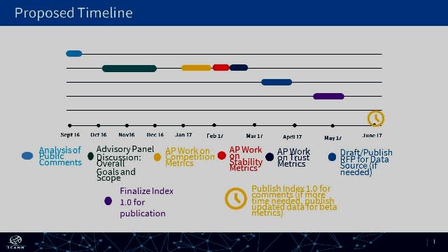 In november 2015 publiceerde ICANN een oproep voor input en vrijwilligers om mee te werken aan een nieuw op te zetten gTLD Marketplace Health Index (werknaam). Doel van de Index was om de kracht van de markt voor gTLDs te meten op 3 onderdelen: gezonde mededinging, consumentenvertrouwen en marktstabiliteit. Een prijzenswaardige doelstelling, maar wel een ambitieuze. Veel ICANN-volgers vragen zich ook hardop af of deze wel haalbaar is.