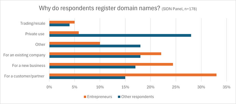Entrepreneurs also differed significantly from other panel members in terms of their inclination to register domain names and their reasons for doing so. As well as having more registration plans, entrepreneurs are responsible for most of the domain names registered for new and existing businesses, or for business partners. Other respondents, including employed professionals, are less likely to have registration plans. And, if they do, those plans are more likely to involve domain names for private purposes, such as creating personal mailboxes.