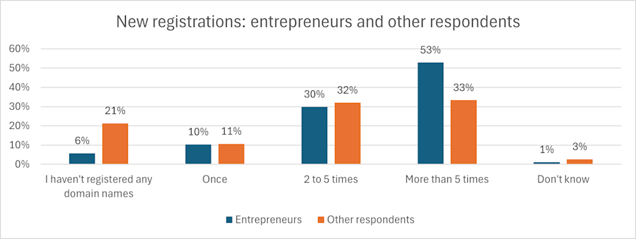 Despite the gloom surrounding the business climate in the Netherlands, SMEs remain the driving force behind business domain name registrations. Of the entrepreneurs who responded to our survey, 92 per cent registered 1 or more domain names in the last 12 months, compared with 76 per cent of the respondents in direct employment. The disparity between entrepreneurs and others was greatest amongst respondents who reported registering more than 5 domain names a year.
